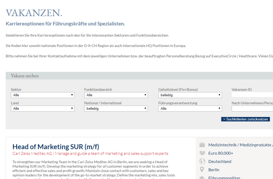 Executive Circle bietet ein Portal für die Suche nach Vakanzen oder offenen Stellen im Gesundheitssektor, weltweit. Potentielle Kunden können angeben, in welchem Bereich sie tätig sein wollen, ihre Gehaltsvorstellungen, und wo auf der Welt sie bereit sind zu arbeiten.